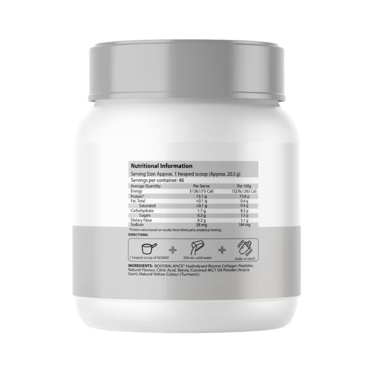 Take 18g of NOWAY® Collagen in 250ml of cold water as a daily protein supplement. After exercise, consume 18g of NOWAY® Juicy Collagen to increase muscle mass and growth. 18g of NOWAY® Collagen consumed throughout the day when you are hungry may stop you from eating something naughty as it increases fullness and may reduce excessive calories at the next meal.