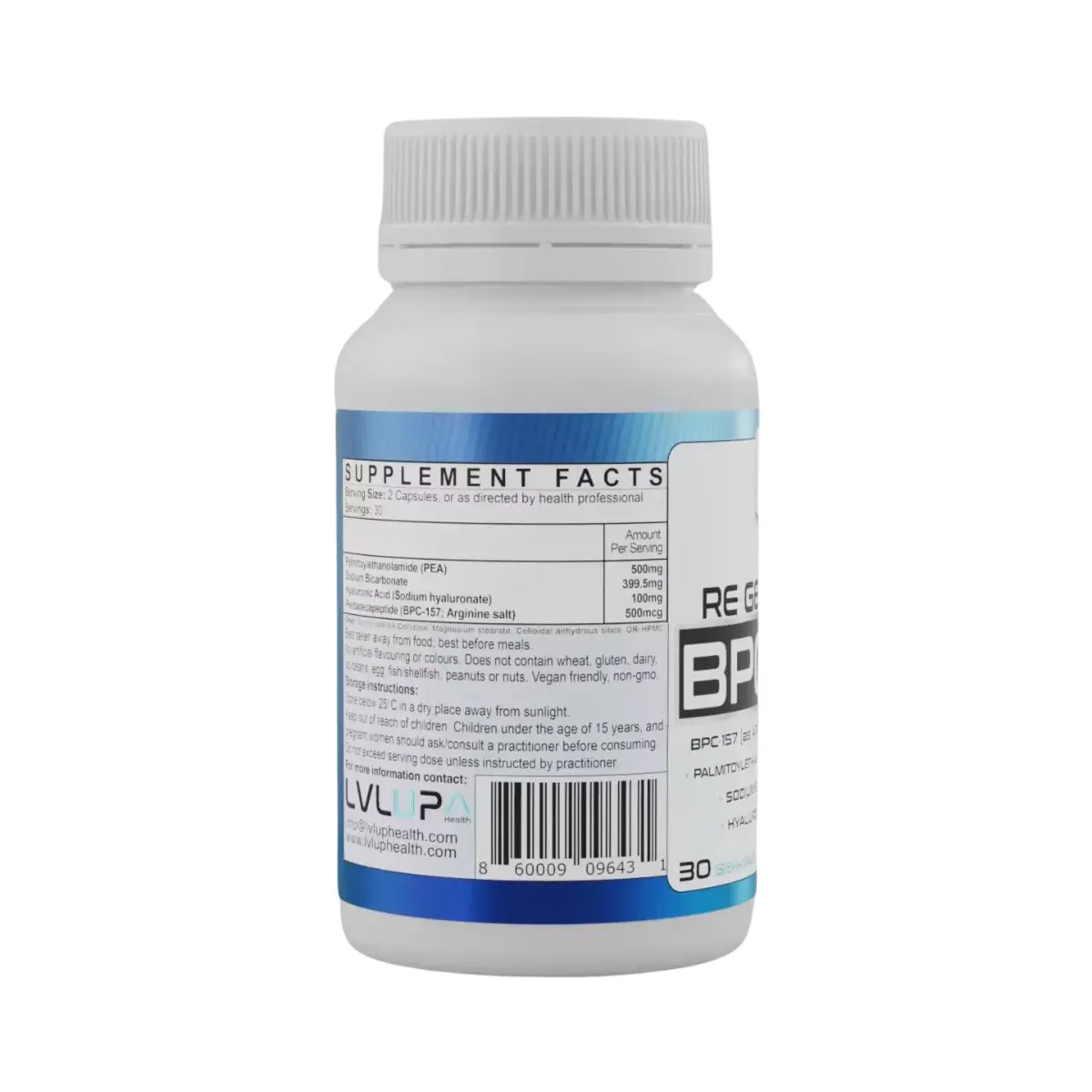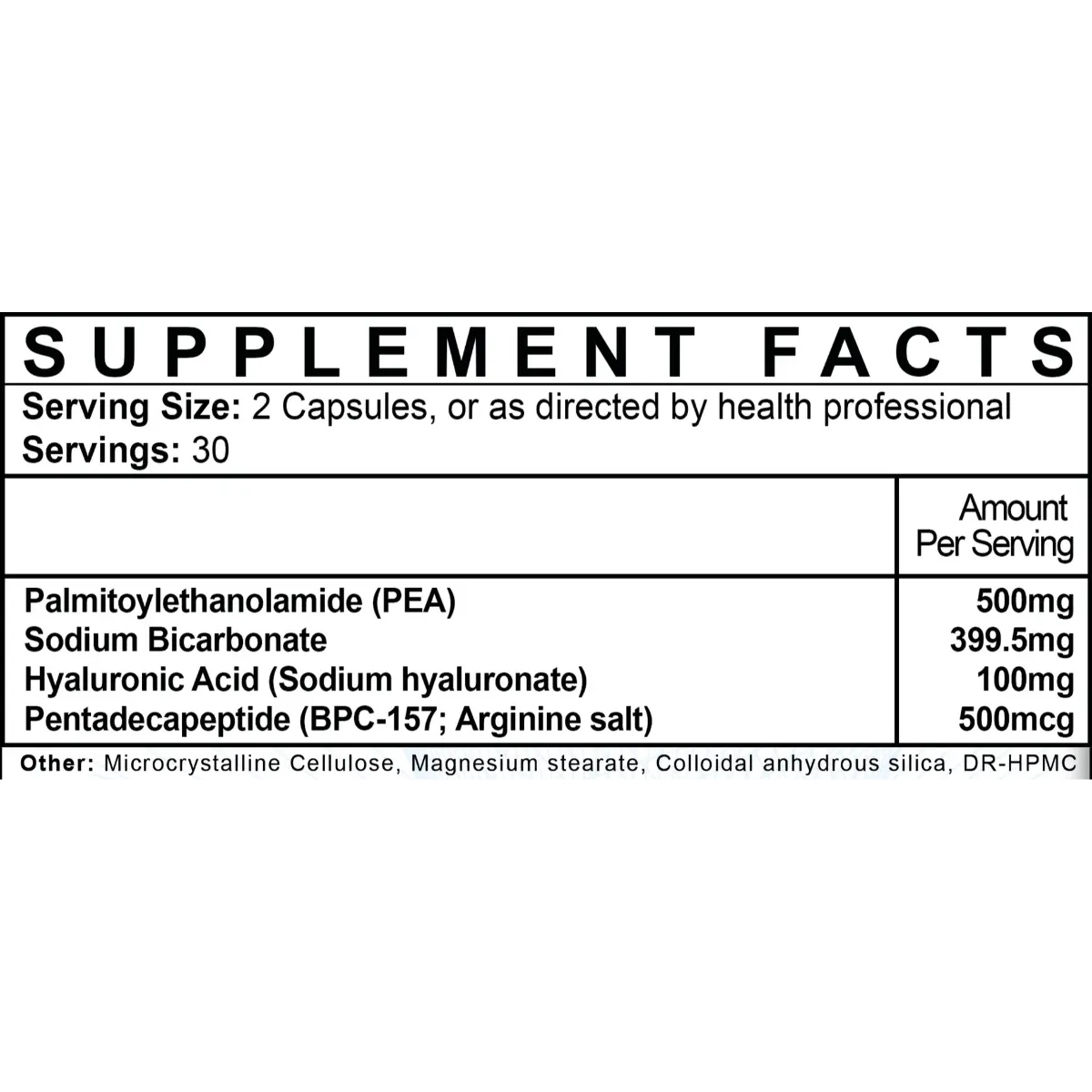 A synergistic blend of highly orally bio-available BPC-157 (as Arginine Salt) with Palmitoylethanolamide (PEA), Hyaluronic Acid (HA), and Sodium Bicarbonate (Stomach acid buffer/Peptide absorption enhancement) to deliver superior full-body regeneration.
