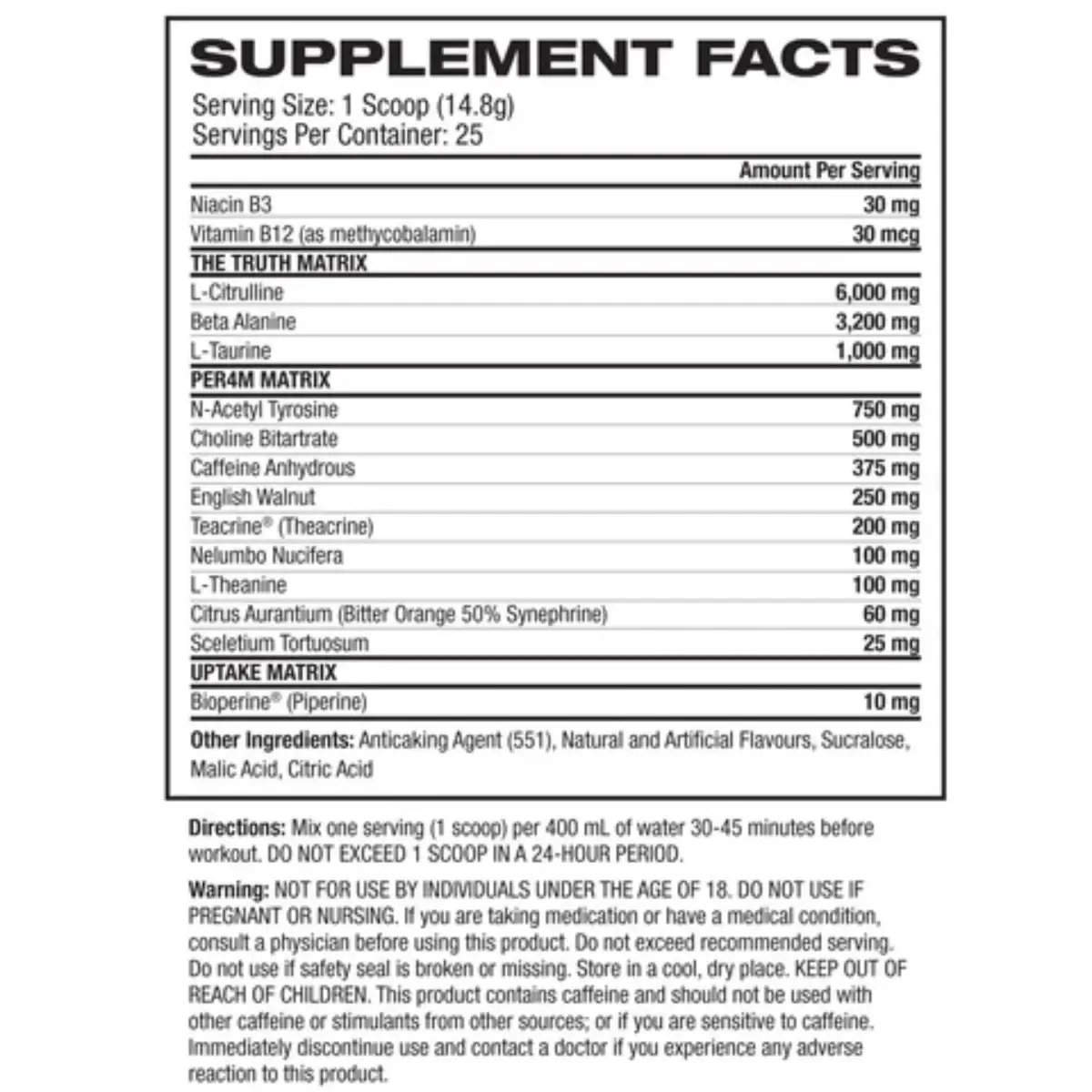 Directions: Mix 1 scoop (approx. 10g) with 300-400ml of cold water and consume 20-30 minutes before training.