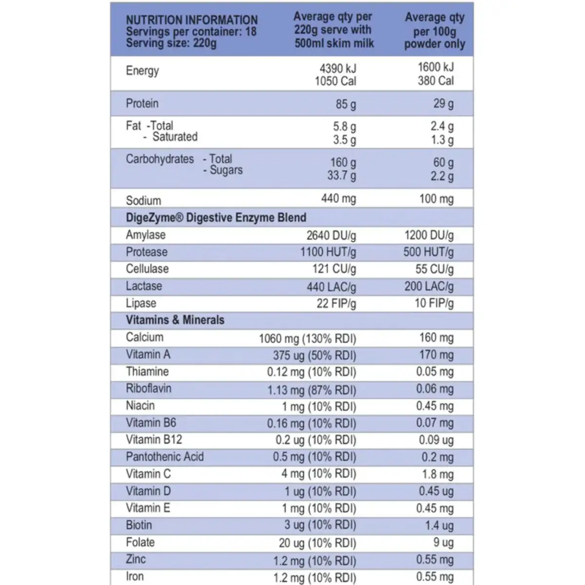 This incredible, carb-packed protein powder is full of the nutrients and protein you need to perform at your peak and is International Protein’s best supplements to gain weight. It is super high calorie, with 1050 calories per serve when you mix it with skim milk as directed. You can choose to take it as two half-size serves or all in one massive protein hit. Each serving delivers you a massive 85 grams of protein. It’s the ultimate answer if you’ve been scratching your head as to how to gain weight with a fast metabolism.