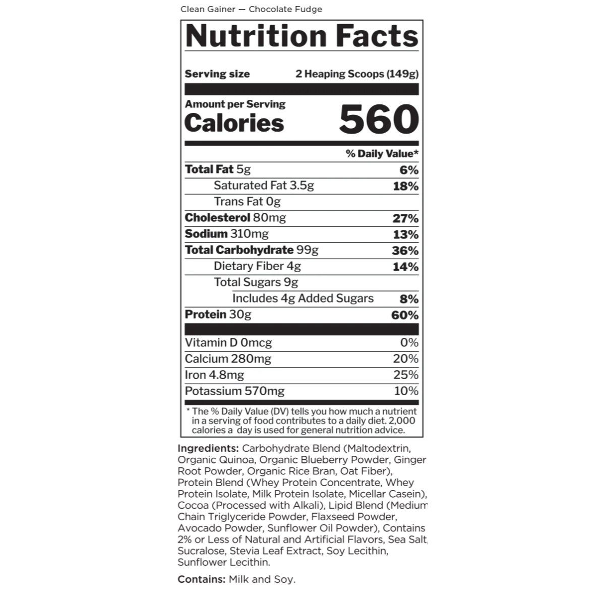 The Rule 1 Protein Clean Gainer contains a blend of Organic Quinoa, Organic Blueberry Powder, Ginger Root Powder, Organic Rice Bran, Oat fibre and Maltodextrin. Each serving contains 99g of carbohydrates.