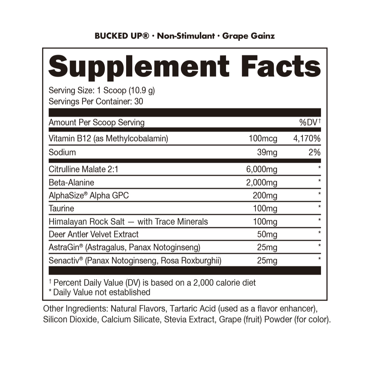 BUCKED UP® NON-STIM pre workout is loaded with scientifically backed ingredients, at clinically effective dosages. Also includes all natural flavoring and no artificial sweeteners or coloring. BUCKED UP® is a game-changer and doesn’t use proprietary blends. We have nothing to hide. You won’t find ineffective doses of any ingredients in BUCKED UP® because we know that you don’t want to pay for a supplement that isn’t going to work. BUCKED UP® is effective for serious athletes, bodybuilders, and anyone else looking to up their game.