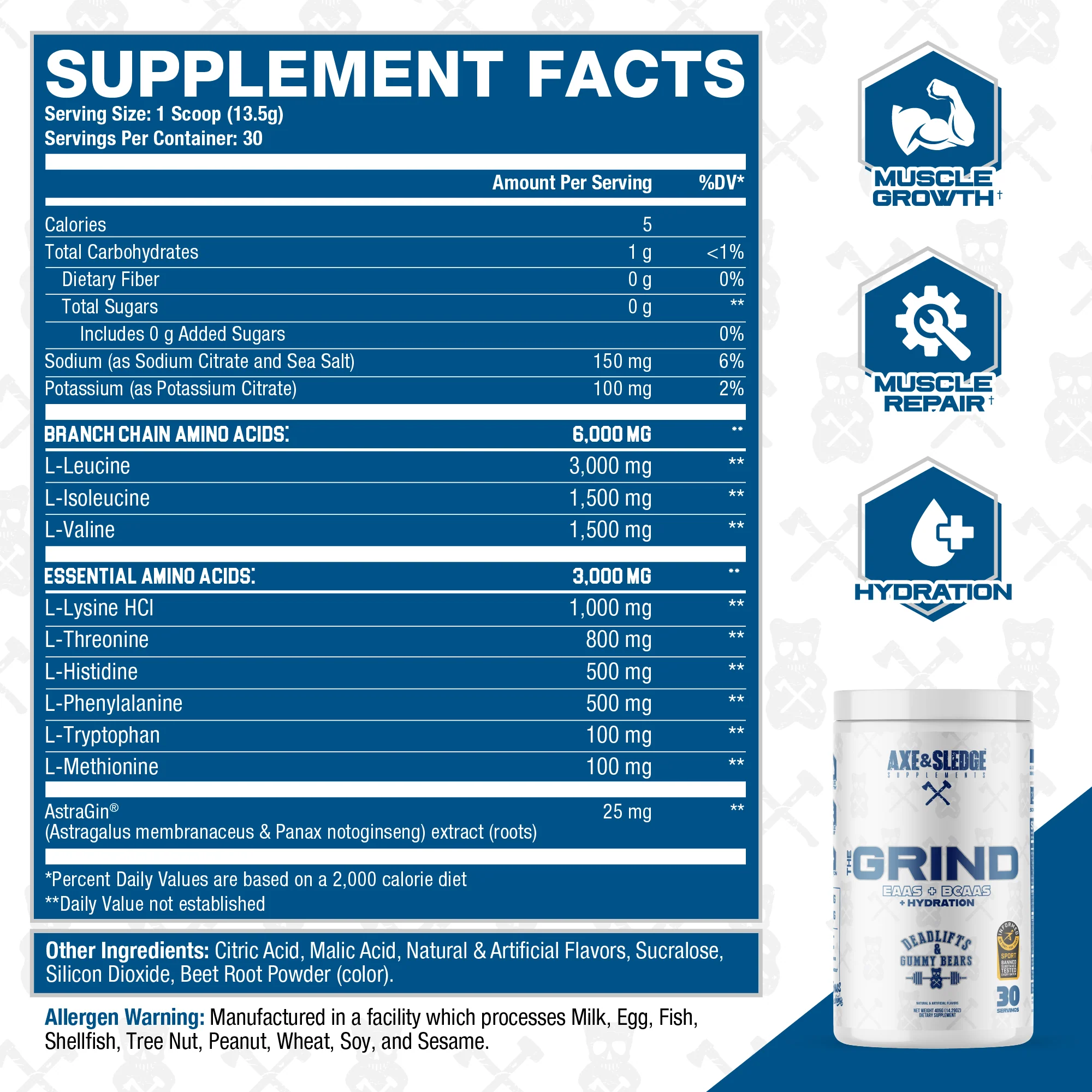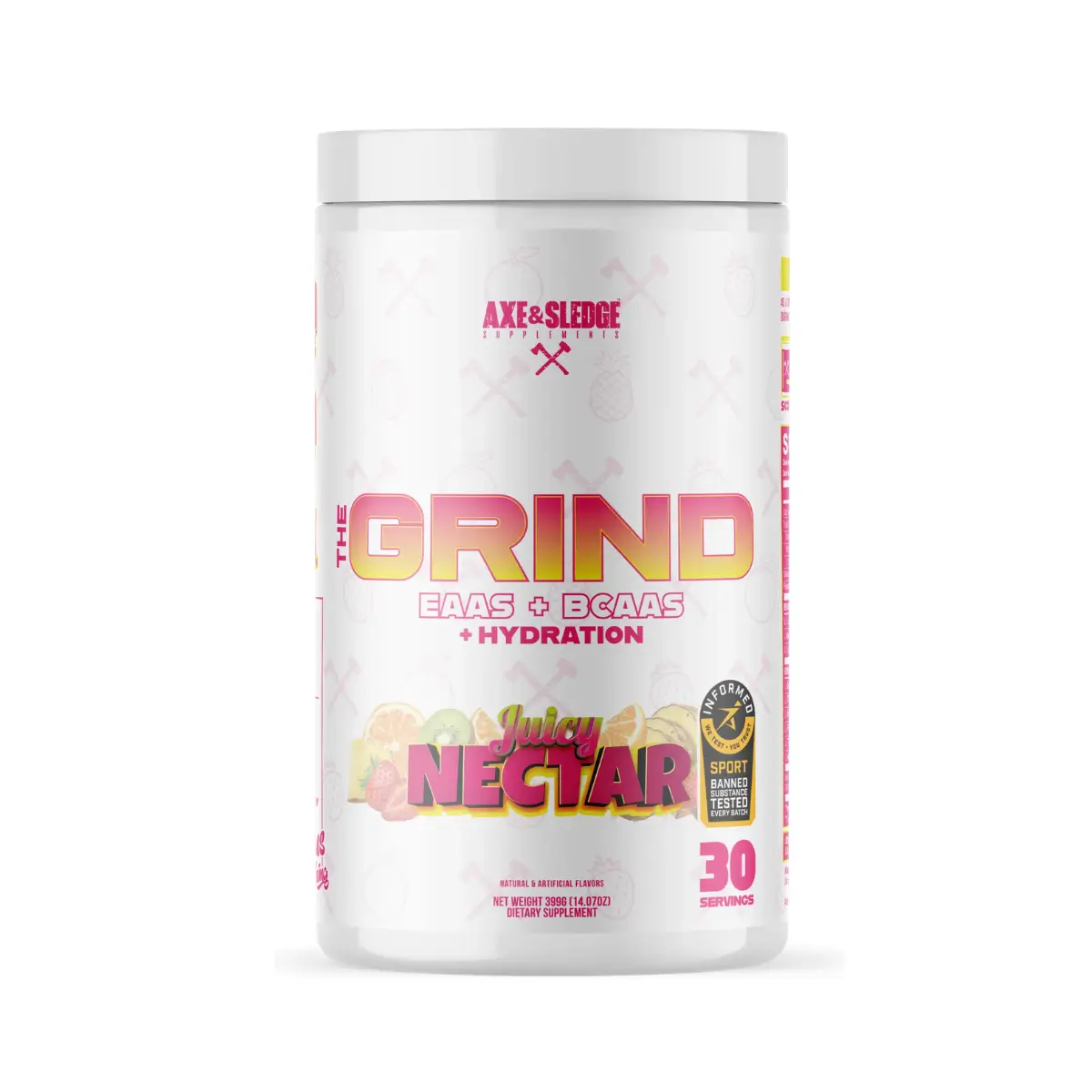 EVERY SCOOP OF THE GRIND PROVIDES YOU WITH A TOTAL OF 7.5 GRAMS OF ESSENTIAL AMINO ACIDS, INCLUDING 5 GRAMS OF BRANCHED-CHAIN AMINO ACIDS IN A 2:1:1 RATIO. THE GRIND IS GLUTEN-FREE, SOY-FREE, SUGAR-FREE, ZERO CALORIES, AND TASTES INCREDIBLE! THE GRIND IS THE PERFECT SUPPLEMENT TO CONSUME INTRA-WORKOUT TO KICKSTART THE RECOVERY PROCESS SO YOU’RE READY TO ATTACK THE NEXT WORKOUT!